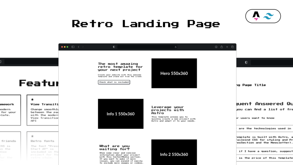 Retro Landing Page is a functional landing page template built with Tailwind CSS and Astro.